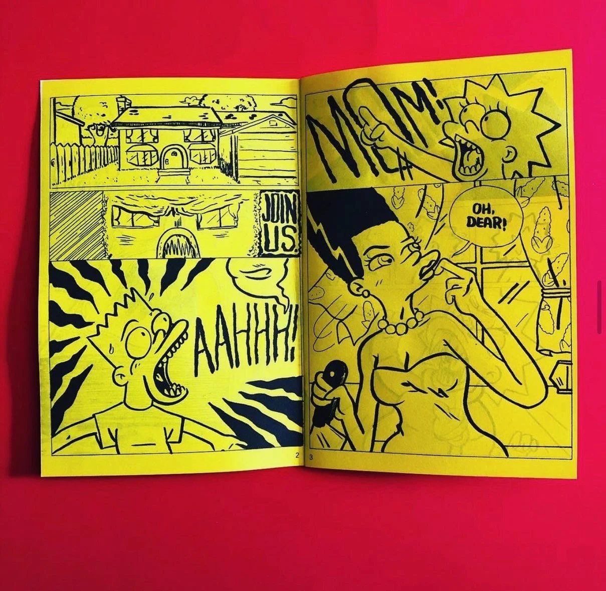 Bootleg of Horror is a unlicensed horror comic featuring The Simpsons. Written, illustrated, designed, and published by Carlos Aguilar. It’s a play on the famous Treehouse of Horror series and the movie Evil Dead 2. Illustrated in black and white, printed on yellow paper, and printed as a 24 page limited edition zine on a texturized cardstock.